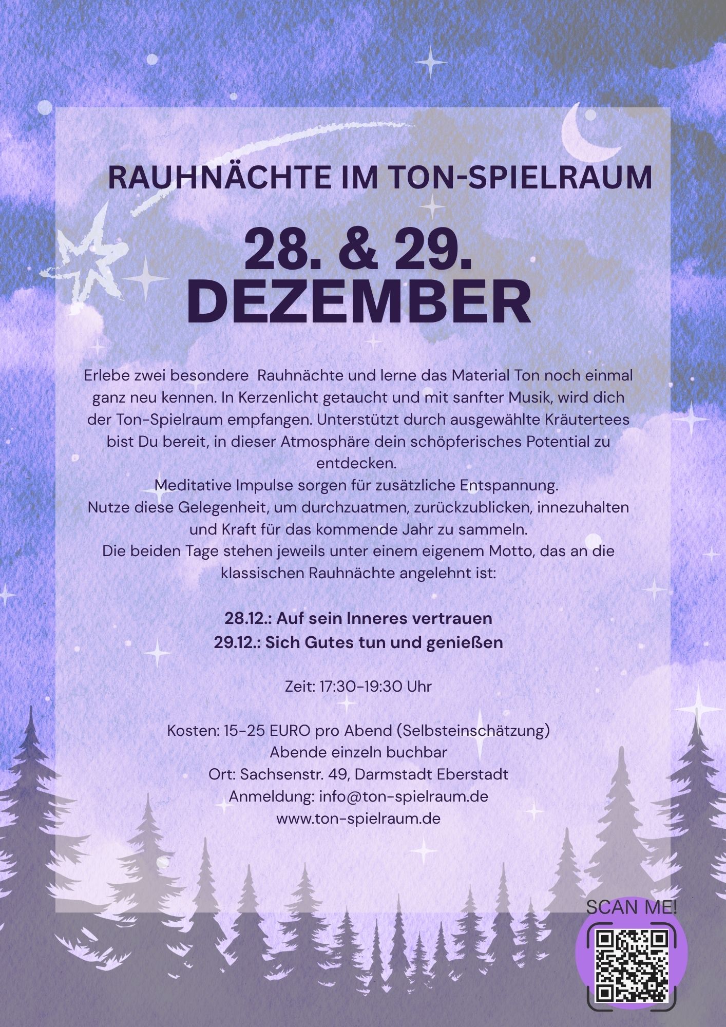 Die Rauhnächte sind zwölf Nächte rund um den Jahreswechsel, traditionell vom 25. Dezember bis zum 6. Januar (Heilige Drei Könige). Diese Zeit zwischen dem neuen und dem alten Jahr wird in manchen Kulturen mit besonderen Ritualen gefeiert. Daran angelehnt nehmen wir uns an zwei Tagen Zeit um durchzuatmen, zurückzublicken, innezuhalten und Kraft für das kommende Jahr zu sammeln. Dazu nutzen wir neben dem Material Ton auch andere Methoden aus dem Yoga und der Meditation. Die beiden Tage stehen jeweils unter einem eigenem Motto, welche jeweils von den traditionellen Rauhnächten stammt: