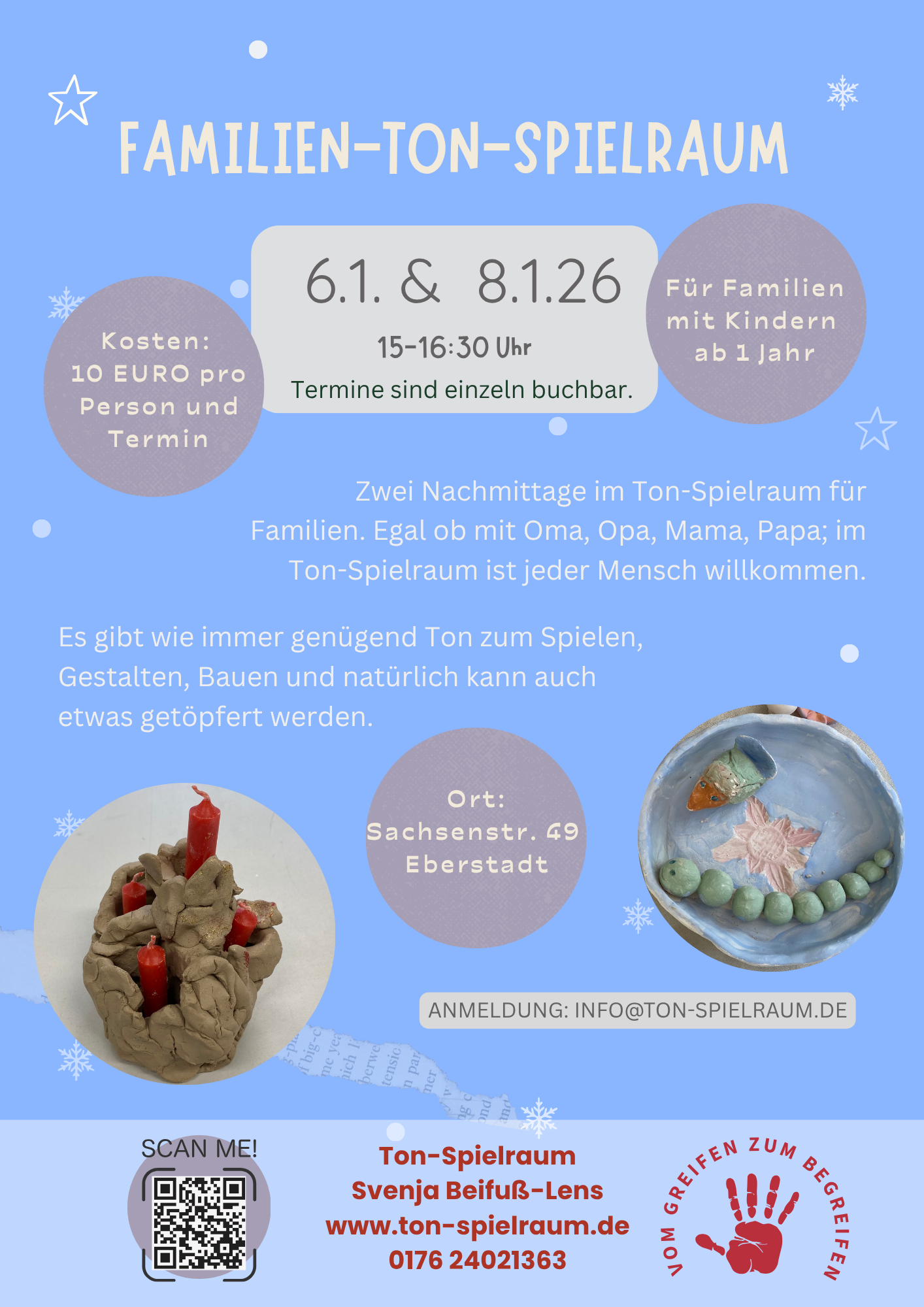 Zwei Nachmittage im Ton-Spielraum für Familien. Egal ob mit Oma, Opa, Mama, Papa; im Ton-Spielraum ist jeder Mensch willkommen. Es gibt wie immer genügend Ton zum Spielen, Gestalten, Bauen und natürlich kann auch etwas getöpfert werden.
