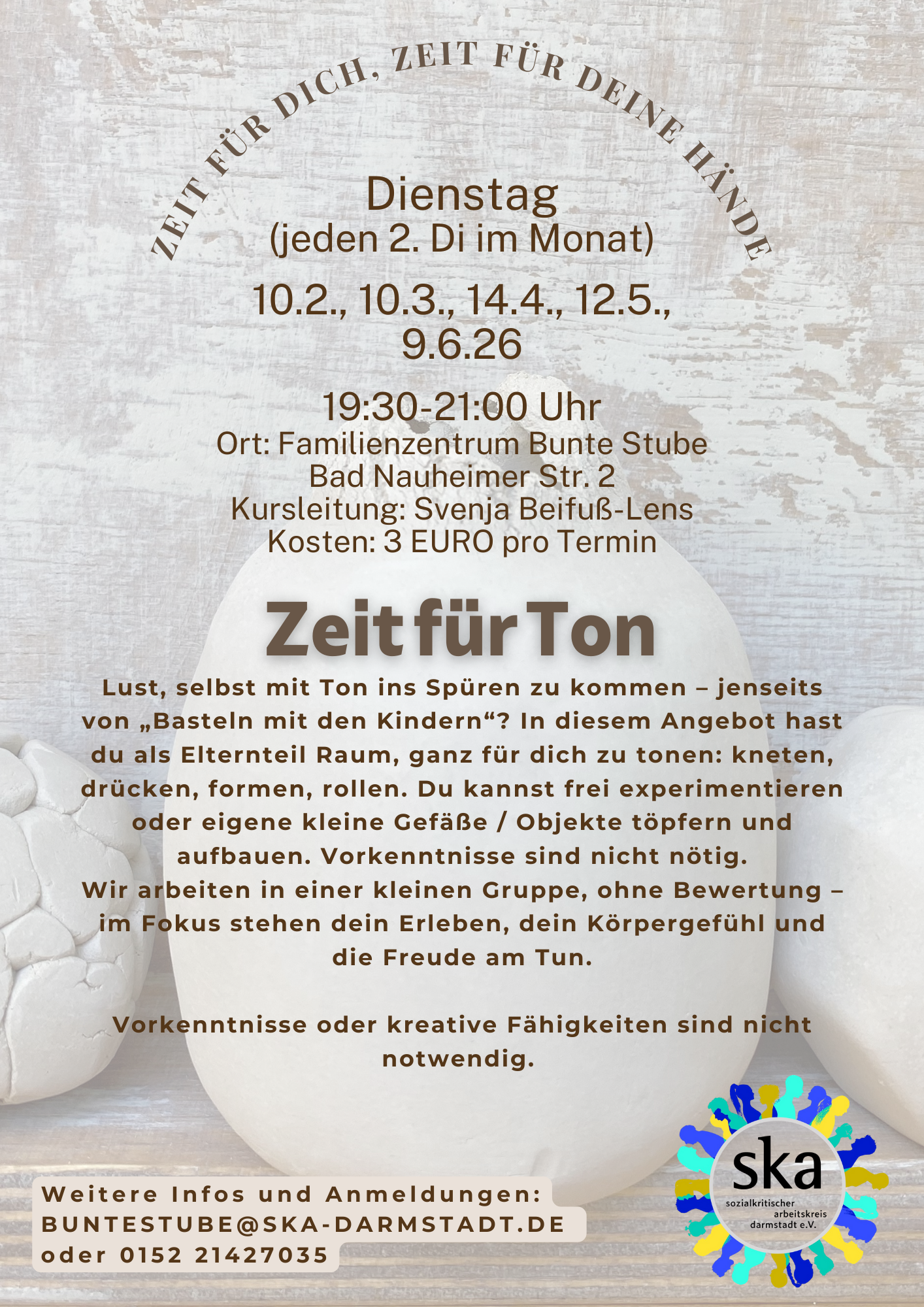 Lust, selbst mit Ton ins Spüren zu kommen – jenseits von „Basteln mit den Kindern“? In diesem Angebot hast du als Elternteil Raum, ganz für dich zu tonen: kneten, drücken, formen, rollen. Du kannst frei experimentieren oder eigene kleine Gefäße / Objekte töpfern und aufbauen. Vorkenntnisse sind nicht nötig.